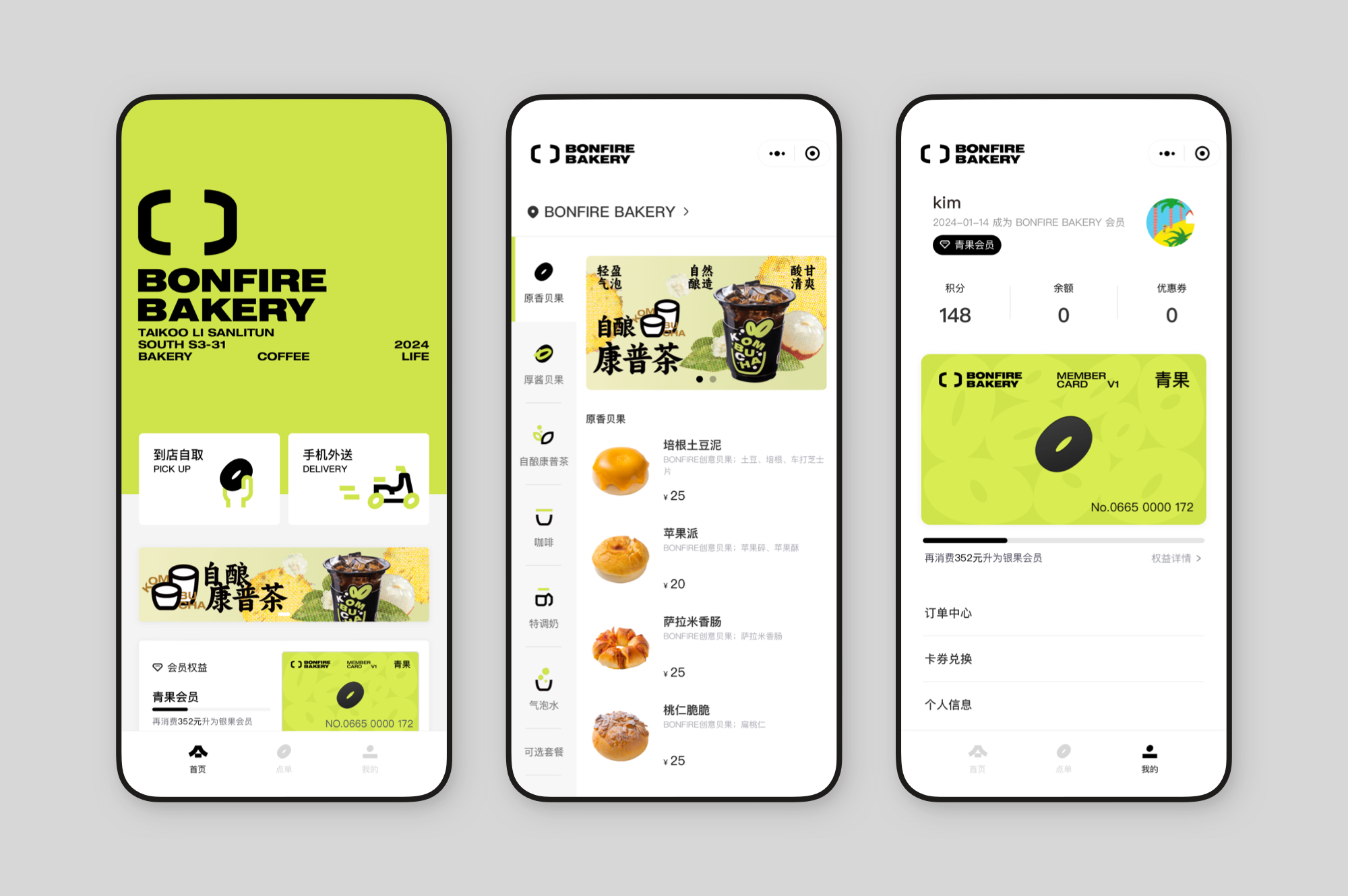 BONFIRE BAKERY是以贝果为特色产品的烘焙品牌,品牌门店位于三里屯太古里南区,空间集合烘焙、饮品、生活方式产品为一体,为都市消费者提供丰富多元的贝果烘焙品选择。以品牌特色产品贝果为灵感,我们为BONFIRE BAKERY设计了从标识 - VI系统 - 包装设计 - 产品物料设计 - 营销海报 - 线上小程序等一系列线上线下的视觉创意输出,帮助品牌找到差异化的视觉表达,在同类型品牌中脱颖而出。